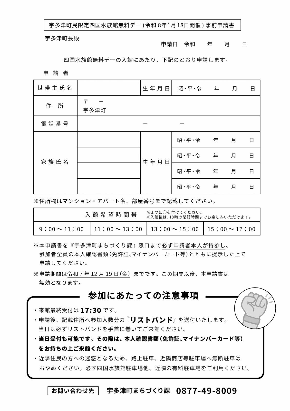 - 申請書(広報うたづ12月号に折込み、または下記様式をダウンロード)に必要事項を記入